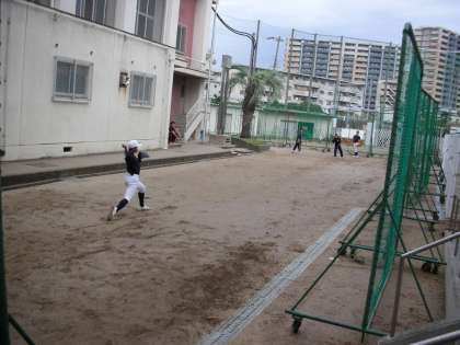 野球部は、体育館と仮設校舎の間の狭いグラウンドで練習をしています。