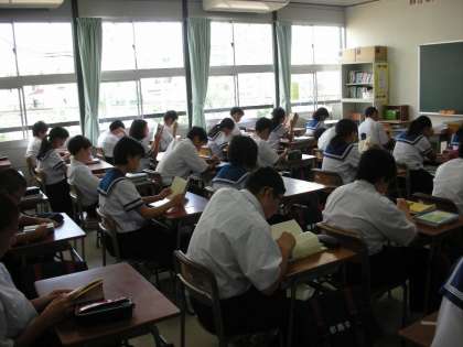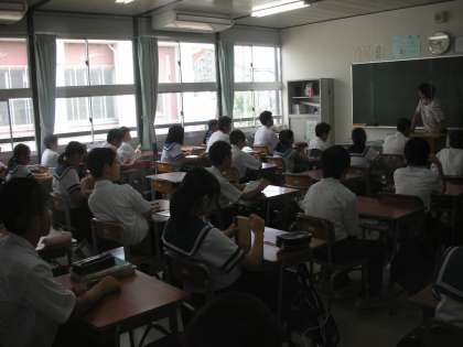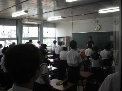 1組では、山川先生がお話をしています。生徒たちは、お話を聞いています。
