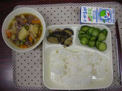 本日は、肉じゃが、焼きナスの味噌だれかけ、あっさりきゅうり、米飯、牛乳でした。肉じゃがは、じゃがいも、糸こんにゃく、たまねぎ、ニンジン、グリンピースと彩り豊かな食材がたっぷりと入っていて、味が良くしみこんでいました。