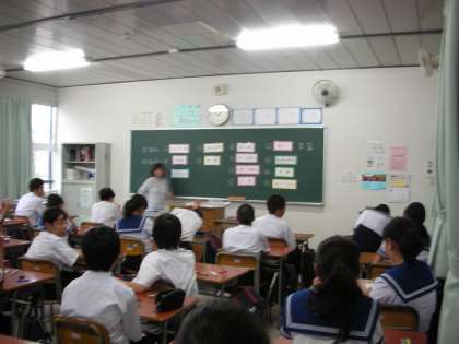 1組は、家庭科の授業です。中田先生が様々な栄養素を黒板に張り出し、色分けもされているので、わかりやすくし益されています。