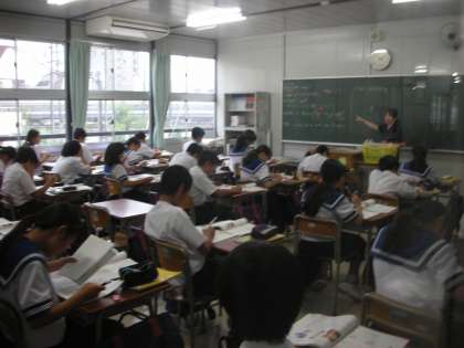 2組は、卯野先生の英語です。黒板に書かれた文章を全員で発音しています。元気な声が聞こえてきます。