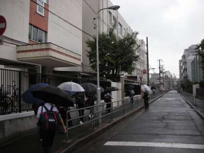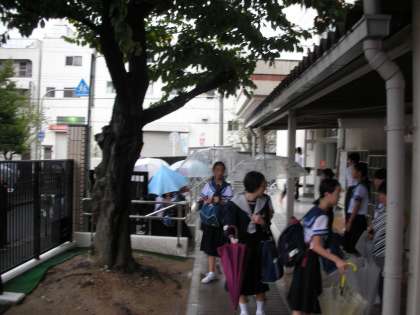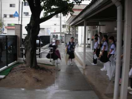 雨の日の登校風景です。体育館前の正門は、あくまでも仮のものなので、少し狭いです。そのため、多くの人が一度に通過することができないことが難点です。