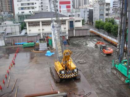 雨が工事現場に降り続いています。このあと、工事は続けられます。