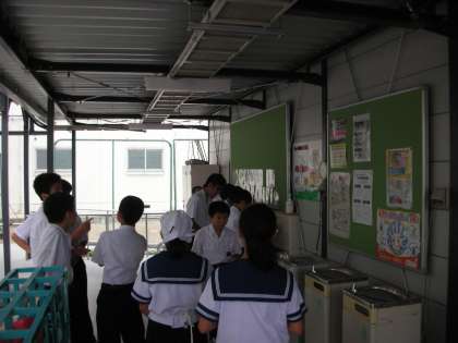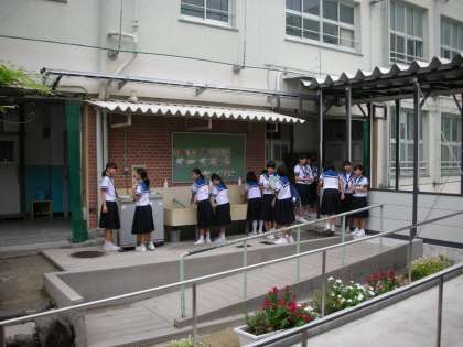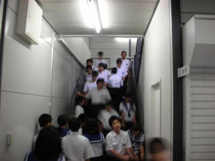 仮設校舎の階段は、手を洗うために降りてくる人と、授業を終えて帰ってくる人が一時に重なるので、込み合います。