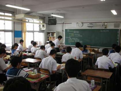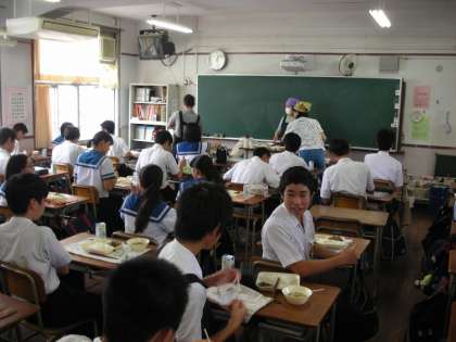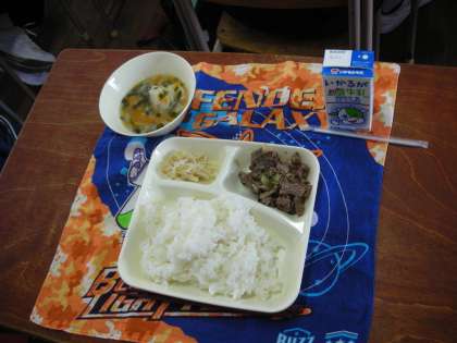 上の写真は、生徒の机上の給食です。ちゃんとランチョンマットの上に置かれています。