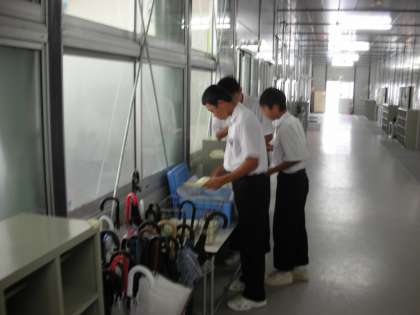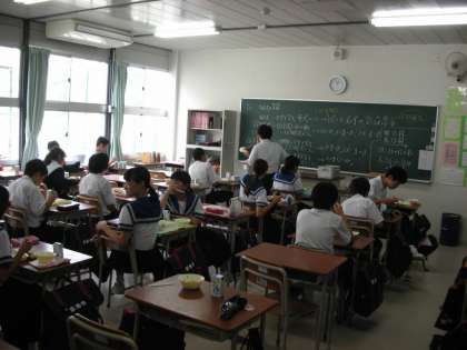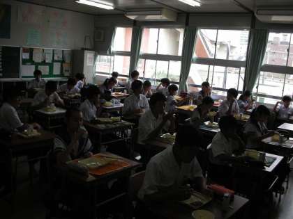 ご飯のおかわりをしている人がいます。しっかりと食べて大きくなってください。