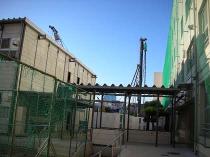 右側が西館、左側が仮設校舎、真ん中が渡り廊下です。その向こう側に重機の一部が見えています。