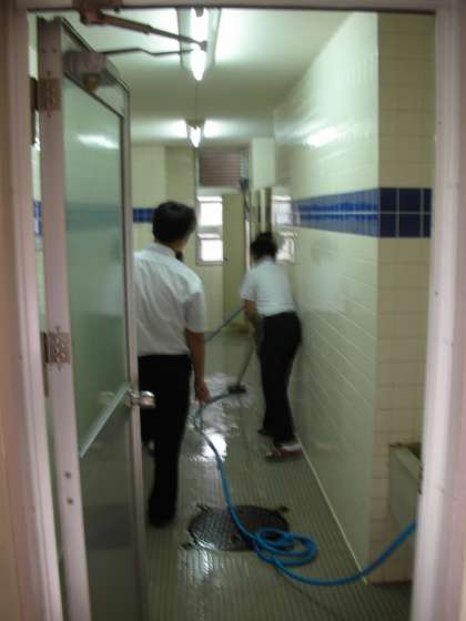 トイレもデッキブラシでしっかりとみがいています。このおかげで、いつも私たちは気持ちよくトイレを使えるのですね。