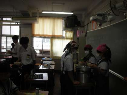 3年3組の給食の様子です。すべてのクラスで先生も一緒に準備をしています。