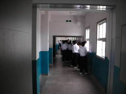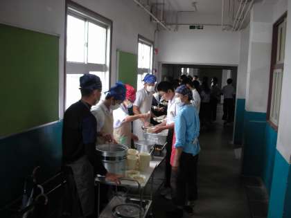 廊下で準備をしているので、食器に盛り付けてもらう人の列ができます。