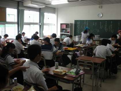 お皿におかずを盛り付けてもらった人は、自分の座席でみんなの準備ができるのを待っています。