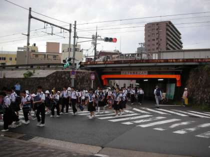 交差点では青信号になると、中学生も小学生も一般の方も一斉にわたり始めます。