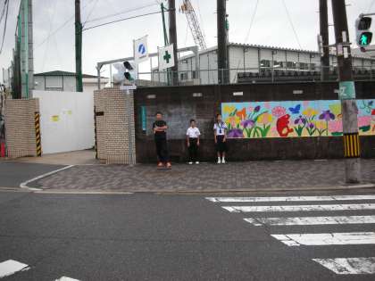交差点の近くでは、風紀委員の人が先生と一緒に「あいさつ運動」をしています。