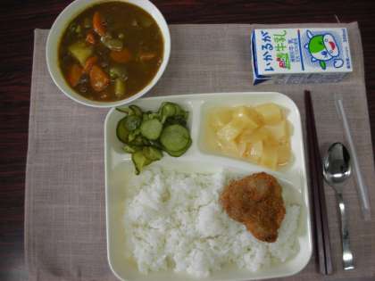 本日の給食は、ビーフカレーライス、一口ヒレカツ、キュウリのピクルス、白桃(カット缶)、米飯、牛乳でした。