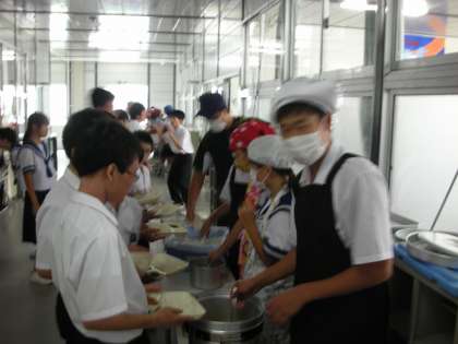 康永先生もエプロン、キャップ、マスクを着けて当番の人と一緒に準備をしています。和やかな雰囲気ですね。