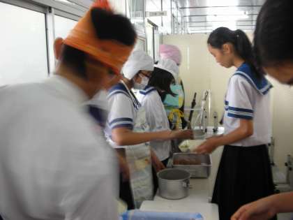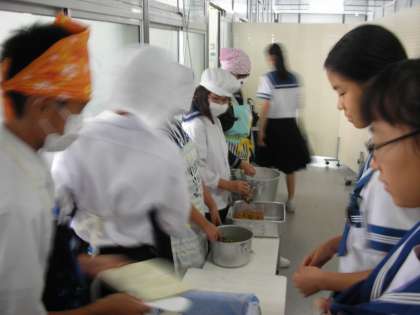 廊下では、当番の人たち準備をしています。生徒たちは慣れてきたようです。小学校時代を思い出したようで、スムーズに準備ができるようになってきました。生徒たちの順応力は、早いですね。