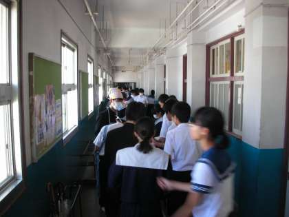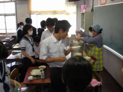 3年3組の様子です。教室と廊下に分かれて、給仕しています。