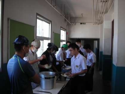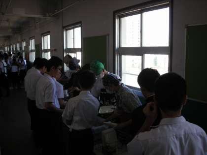 長畑先生が給食当番に指示を出しています。ちゃんと先生もエプロン、三角巾、マスクを身に付けています。