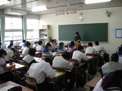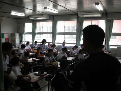 3組は、、生徒たちは『新聞にチャレンジ』をしています。卯野先生が書類を点検しています。
