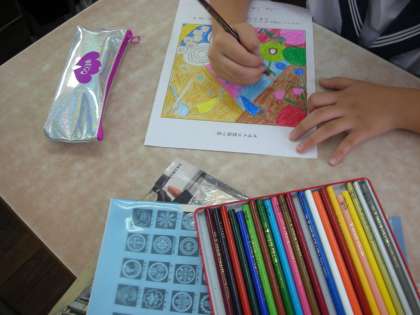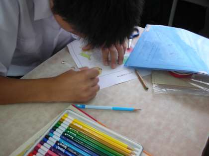 本当に一生懸命作業しています。どのような色を着けたらよいのか、迷った人は、色見本を見て決めている人もいます。想像力を膨らませているのでしょう。頑張れ!