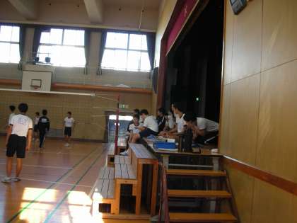 次の試合に出る人は、舞台の上から応援しています。