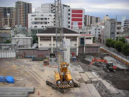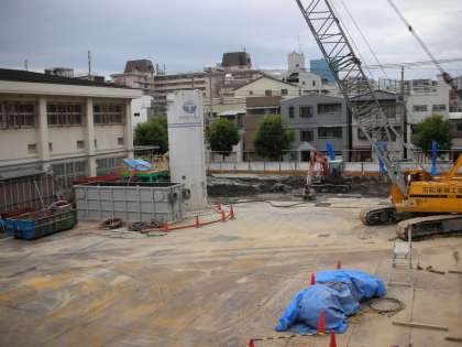 上の写真は西館4階から、下の写真は仮設校舎2階の職員室から撮影したものです。格技室前付近の土が、グレーになっているところがあります。これは、地中から掘り出された汚泥を固めるためにセメントをまいたためだと思われます。そして、ダンプカーで運び出せるようになったら、搬出されます。
