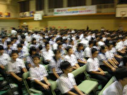 生徒たちは、司会者の席を見て、「まだかな」という表情をしています。