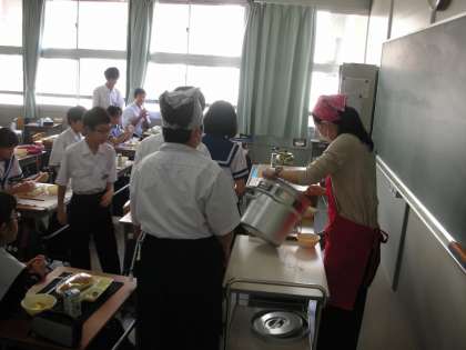 やはり、先生がたが生徒と一緒に給食の準備をしています。とても良い光景ですね。
