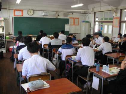 先生が連絡事項をお話しています。生徒のみんなは、お話を聞いています。
