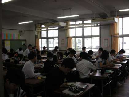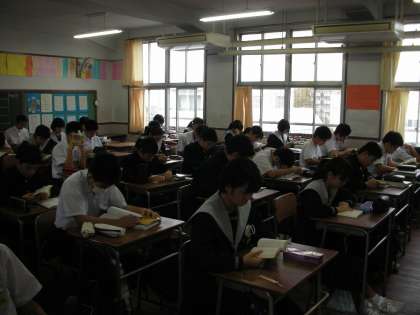 先生たちが、朝の打ち合わせをしている間、生徒たちは読書時間です。真剣に本を読んでいます。話し声は聞こえません。