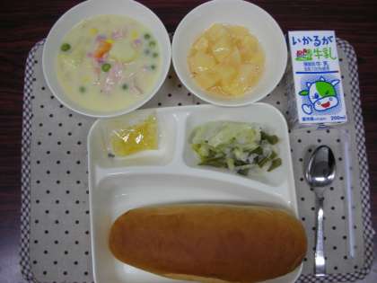 本日の給食は、コーンクリームシチュー(米粉)、キャベツと三度豆のサラダ、白桃(カット缶)、パン、牛乳でした。
