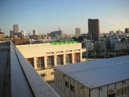 仮設校舎の向こう側は、体育館です。体育館の屋上には、プールがあります。プールに緑色のテントが見えますが、このテントは台風21号が大阪を通過した時に、びりびりに破れてしまいました。その後、補修したのです。きれいに仕上がっています。