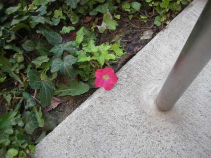 一方、仮設校舎から体育館に向かう通路際に可憐な花が一輪咲いています。ひっそりと咲いています。誰かが必ずその華麗さに気づいてくれるものではないでしょうか。