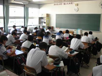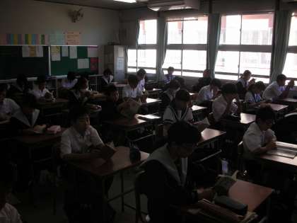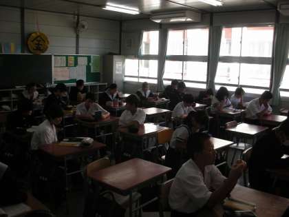朝の1年生です。先生は、打ち合わせをしています。先生が来られるまでの間、朝読書をしています。