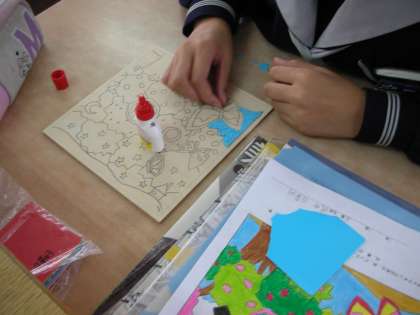 とても細かい作業です。指先をうまく使って、下絵の通りに、細かくちぎった色紙を張り付けています。