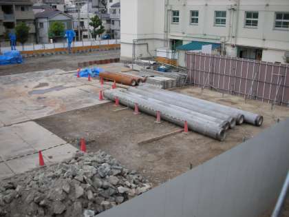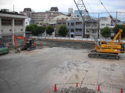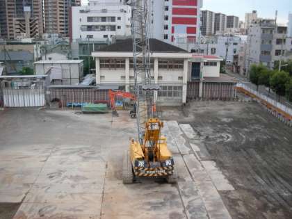 南館の工事現場では、昨日大きな動きがありました。今まで活躍していた杭打ち用の重機が搬出されました。南館が建つ地盤もきれいにならされています。