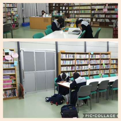 図書室では、3年生女子2名が自主学習をしています。静かな環境で自分のペースで学習しています。