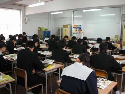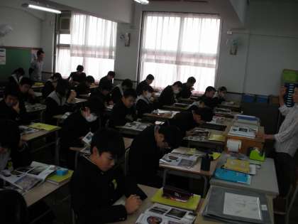美術室では、3年2組が教科書を見ながら学習しています。名作とその作者名がなかなか一致しないこともあるようです。