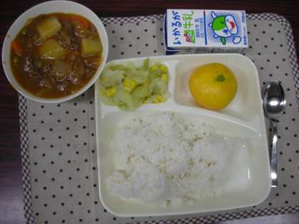 本日の給食は、ハヤシライス(米粉)、キャベツとコーンのサラダ、みかん、米飯、牛乳でした。