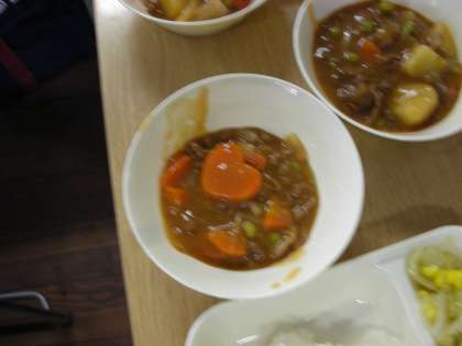 ハヤシライスの中に、ハート形や星形のニンジンが入っています。あたった人は、何か幸運な出来事があるかも。