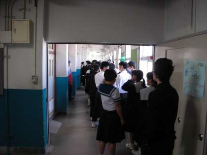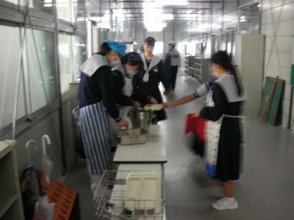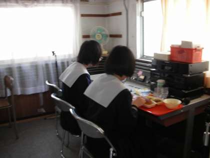 中は、放送室の様子です。放送部の当番の人が給食を食べながら、活動をしています。