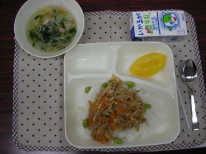 本日は、ピリ辛丼、中華スープ、黄桃(缶)、米飯、牛乳です。
