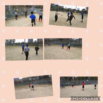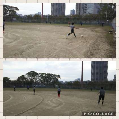 サッカー部は、大川河川敷の野球場で、練習をしています。日頃、狭い所で練習をしているので、今日は、ロングキックを出しています。