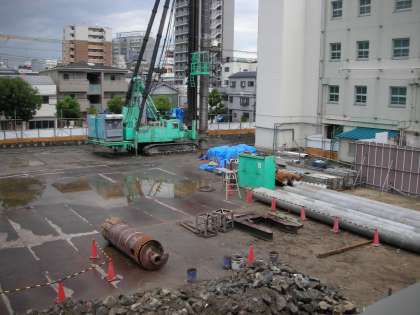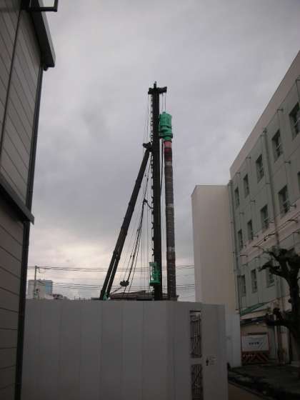 杭を打つ重機が見えます。筒状の太いドリルの上部に24という数字が見えます。杭の長さは、24メートルで、地中にこれだけの長さの杭が埋め込まれるのです。