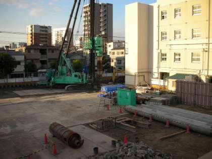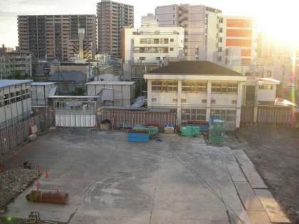 朝日が、工事現場にも仮設校舎にも西館にも降り注いでいます。