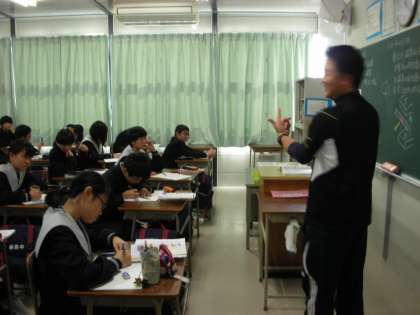 2年4組は、理科の授業です。康永先生がフレミングの左手の法則を動作を交えながら説明しています。