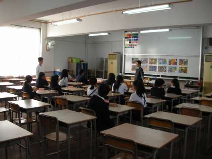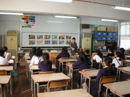 黒板に張り出された上級生の絵画に、「すごい」と、感動していました。