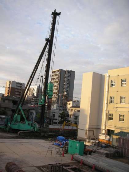 下の写真は、仮設校舎2階から撮影したものです。杭打ちの重機が高くそびえています。右端の円筒形のものが回転しながら、土を掘っていきます。