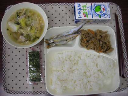 本日の給食は、焼きシシャモ、五目汁、きんぴらごぼう、やきのり、米飯、牛乳でした。