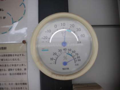 仮設校舎前の温度計は、午前7時現在、気温14.9度、湿度78パーセントです。